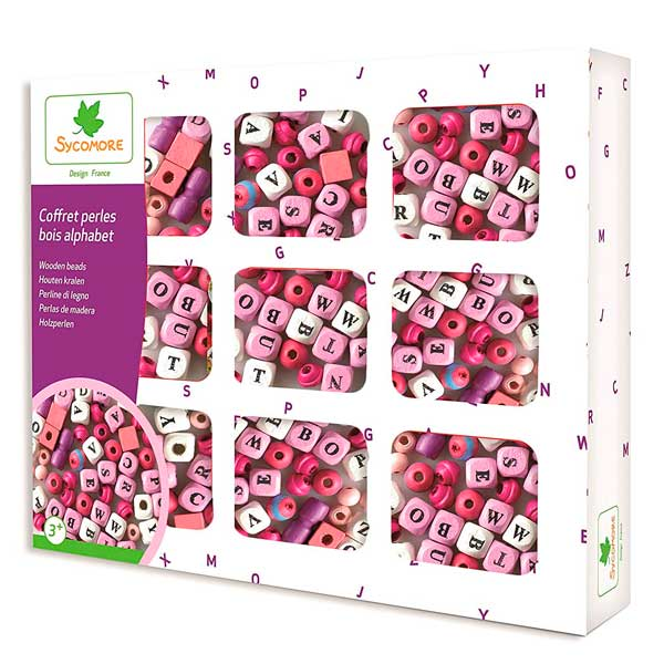 Caja de perlas de madera con letras del abecedario para crear preciosas joyas con múltiples mensajes.