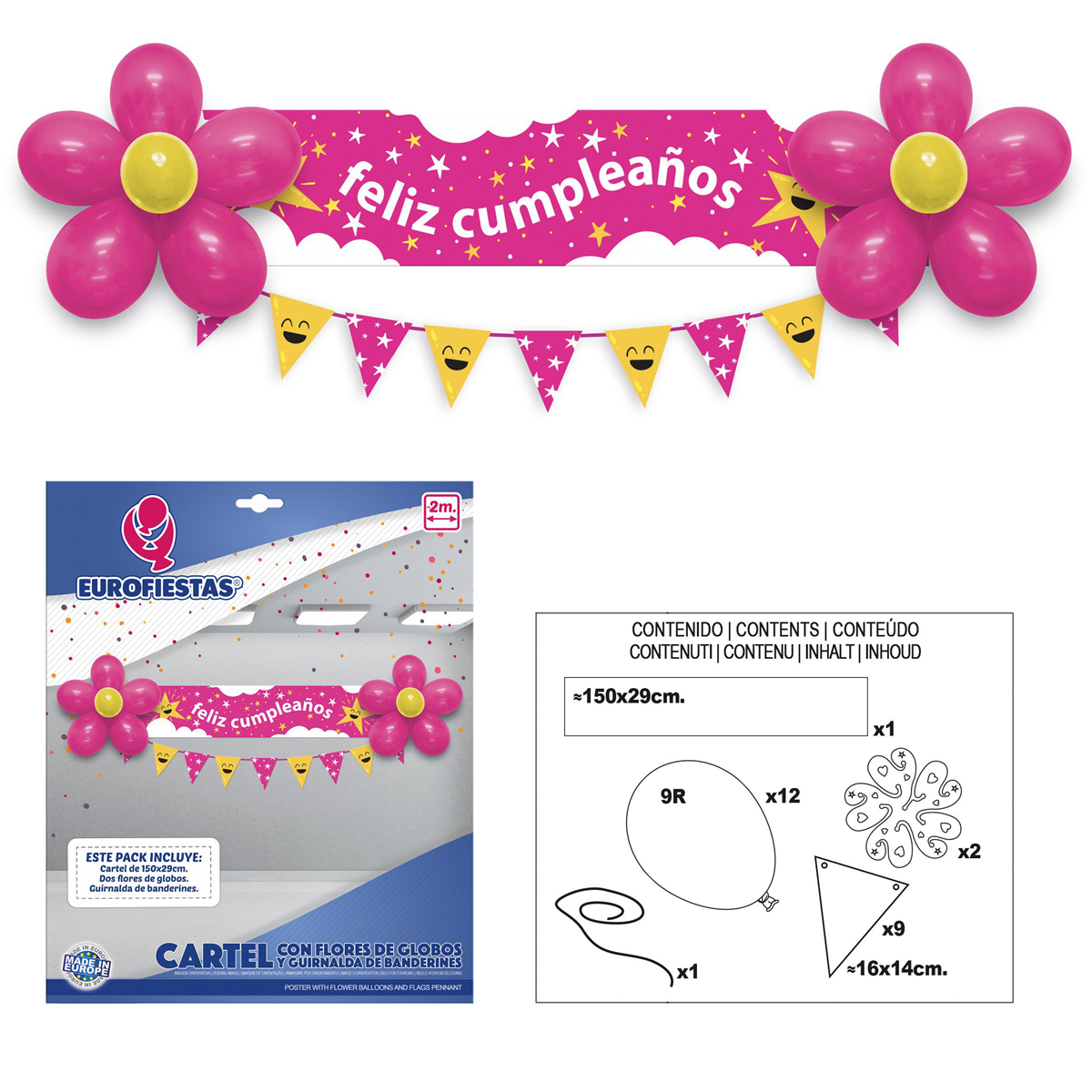 ::: Esclusivo kit FELIZ CUMPLEAÑOS en tono fucsia con el que marcarás la diferencia en tu fiesta. Crea una decoración única con este kit y deslumbra a todos los invitados con la originalidad de este producto. El kit está compuesto por un cartel muy bONITO