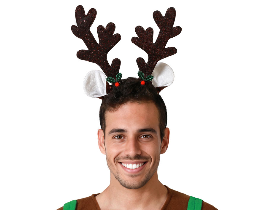 Diadema marrón con cuernos de reno, orejas blancas y decoración de hojas verdes y frutos rojos. Ideal para personajes navideños y ayudantes de Santa.