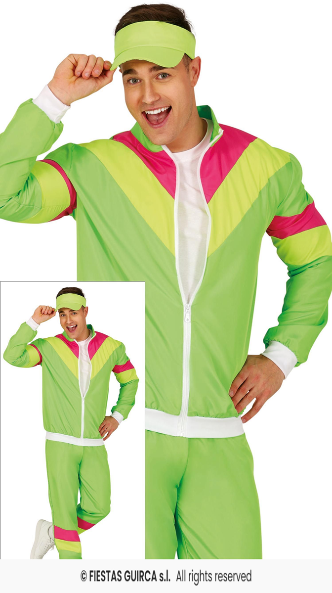 Disfraz de Chándal verde y fucsia neón para hombre . Incluye Chaqueta y Pantalón. No incluye resto de accesorios mostrados en las imágenes.