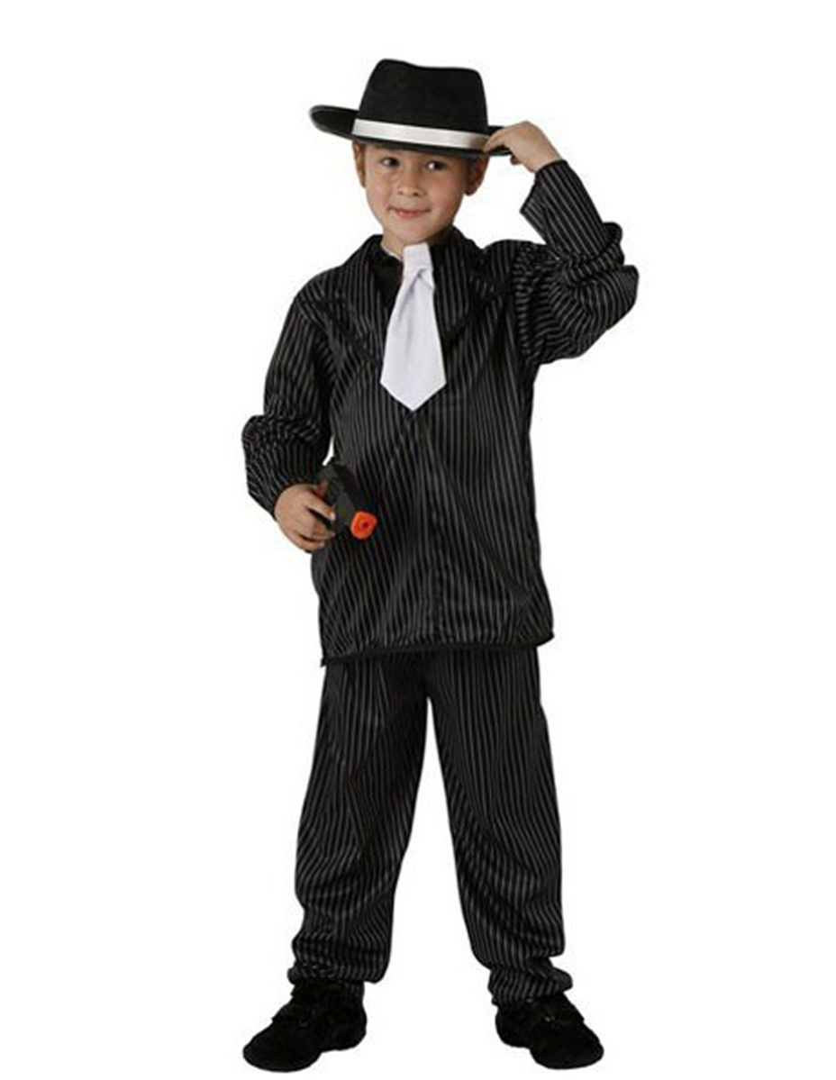 Disfraz de Ganster Niño. Este disfraz fabricado en 100% poliester incluye chaqueta de rayas con cuello y corbata, pantalón a juego con goma en la cintura. Disponible en varias tallas para niños o niñas, se complementa a la perfección con sombrero de ganster y pistola o bigote. Temática años 20, ganster, charlestón