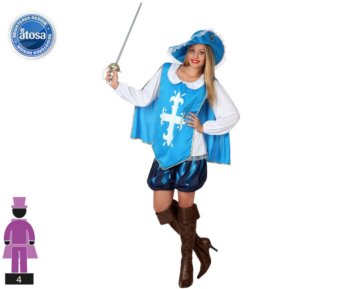 El disfraz mosquetera azul se compone de 4 piezas: un sombrero, una camiseta con peto cosido, una capa y un pantalón corto.