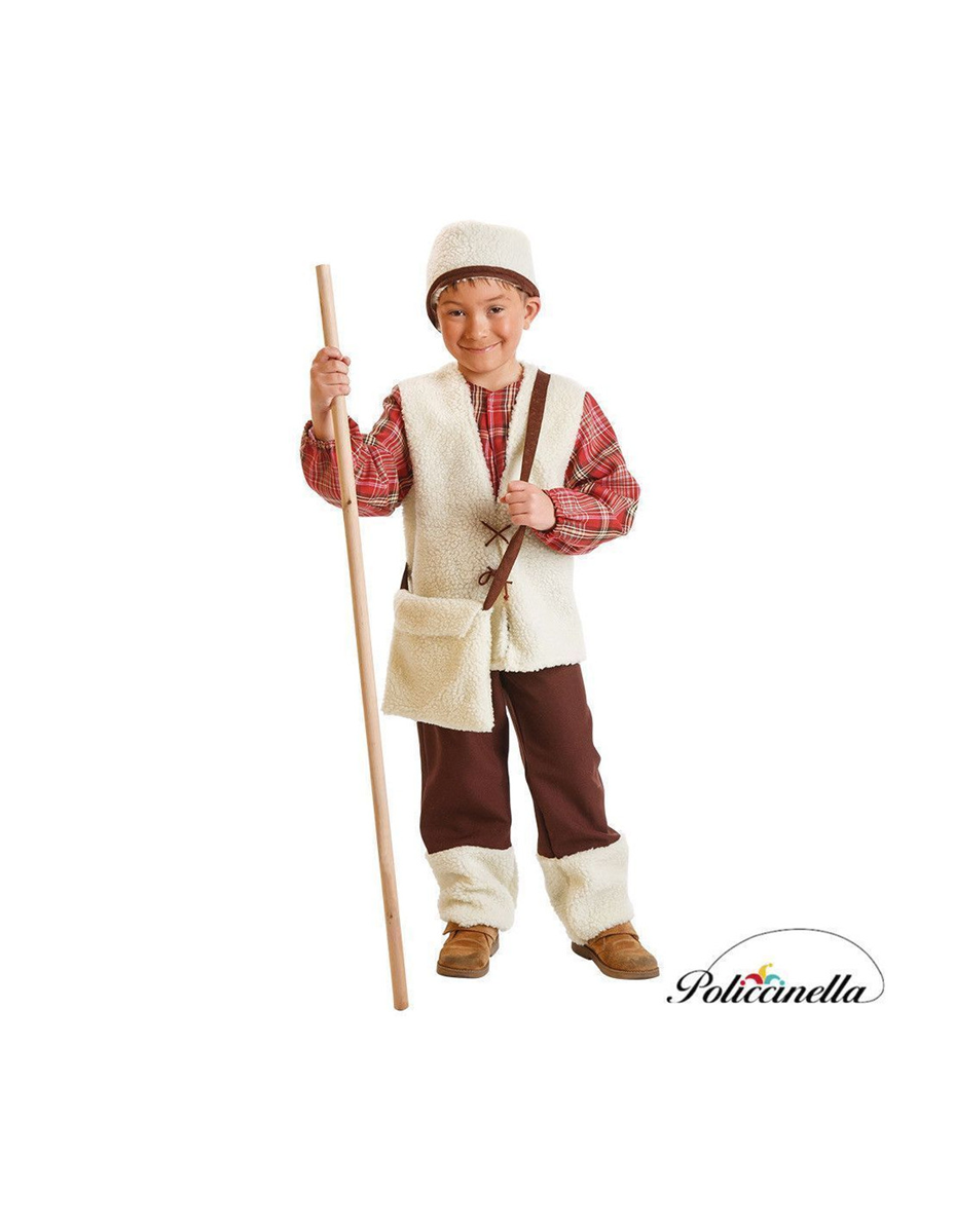 Disfraz de pastor compuesto por camisa con chaleco integrado, confeccionado en una sola pieza. La camisa está elaborada en poliéster tupido ( similar a las mantelerías) mientras que el chaleco simulado al frente, presenta tejido tipo borreguito con lazada decorativa en zigzag. La parte posterior del chaleco está confeccionada en punto de máquina para mayor confort. El pantalón, en punto semielástico, cuenta con cintura elástica y terminaciones en los tobillos decoradas con apliques de borreguito a juego. Incluye gorra y zurrón coordinados, completando el conjunto con coherencia estética
