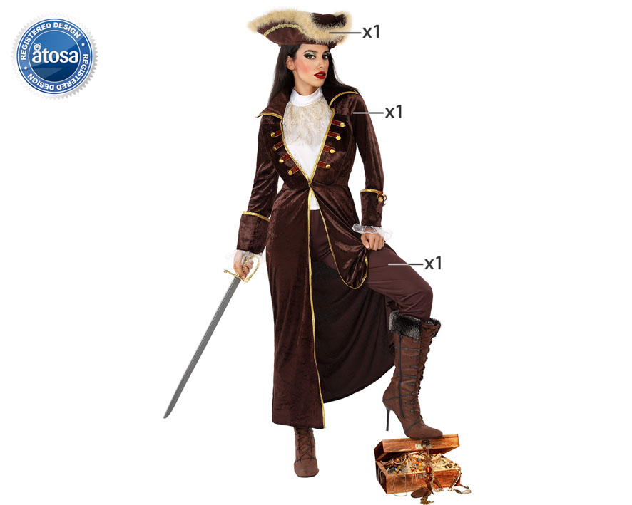 Disfraz talla adulto. Contenido del pack: sombrero, chaqueta y pantalón. No incluye: espada y cofre.