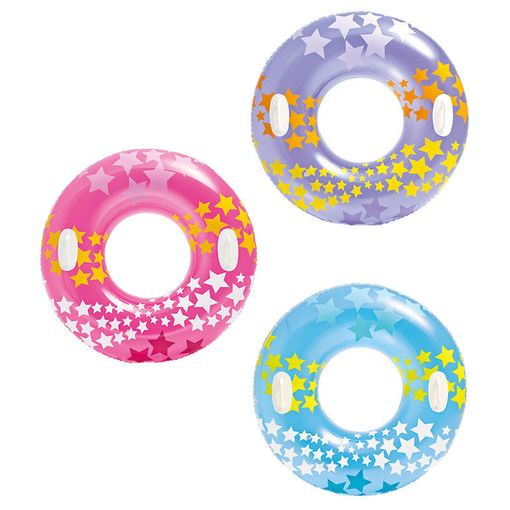 ¿Prefieres la playa o la piscina? Vayas donde vayas acompáñate de esta rueda hinchable Intex. Tiene un diseño muy alegre, con la base lisa disponible en 3 colores (violeta, rosa o azul) y la superficie transparente con estrellas de varios tamaños y colores. Tiene un diámetro de 91 cm y está pensada para un niño o niña de 9 años en adelante. ¡Prepárate para las risas con tu rueda Intex!