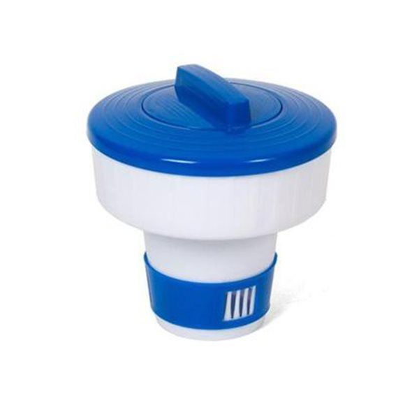 Dispensador de cloro flotante ajustable para piscina. Con este gran dispensador de cloro, podemos realizar el mantenimiento de nuestra piscina de forma fácil y cómoda. Simplemente debemos introducir la pastilla correspondiente en el depósito y ajustar la liberación de cloro al tamaño de nuestra piscina. A partir de aquí, el dispositivo se hace cargo de suministrar el cloro para que el agua se mantenga libre de bacterias e insectos y podamos disponer de unas condiciones higiénicas para nuestra familia. Este dispositivo está fabricado en plástico resistente al sol y al agua en color blanco y azul. Cuenta con un regulador manual para poder ajustarlo fácilmente.