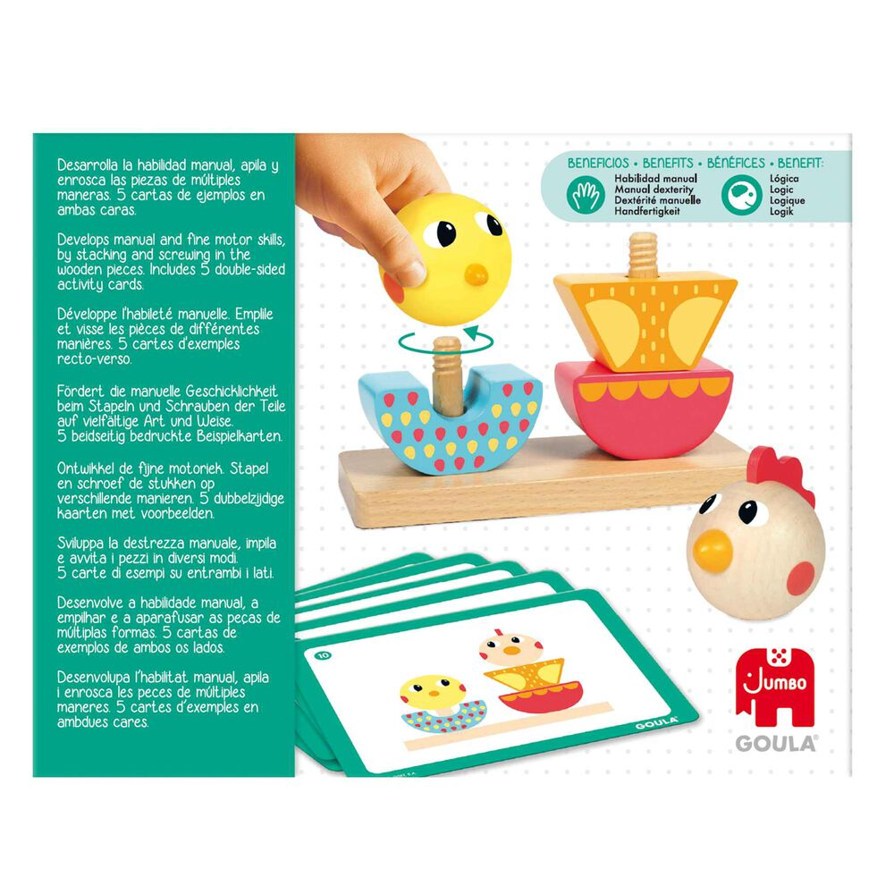 Juego preescolar para apilar y enroscar las distintas piezas de múltiples maneras. En el juguete se incorporan 10 tarjetas con ejemplos de combinaciones diferentes. Uso de madera certificada. Maderas utilizadas de plantaciones controladas protegiendo y conservando nuestros bosques. Edad recomendada: + 24 mese