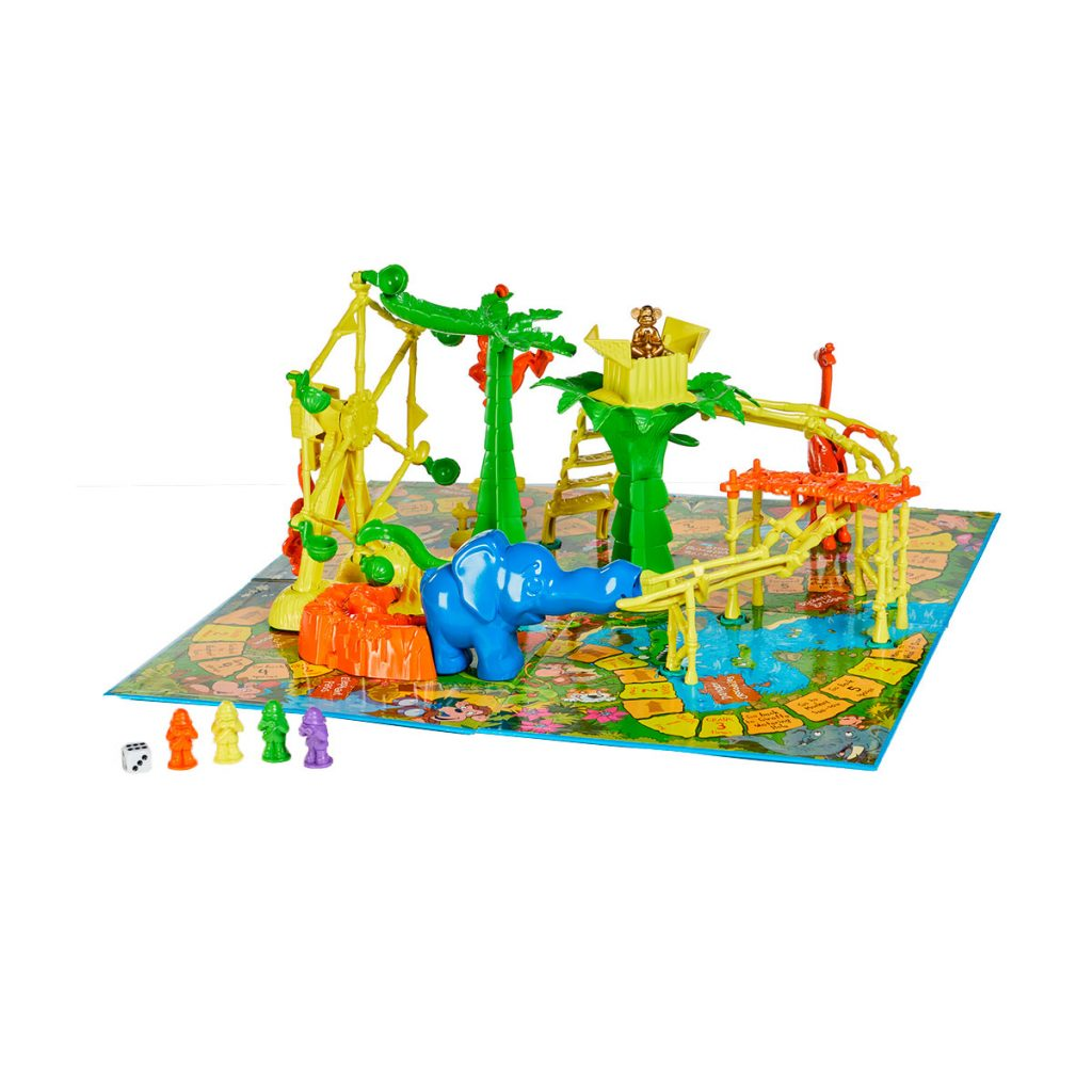Divertido juego de acción en el que cada jugador es un intrépido explorador que ha de ser el primero en atravesar la jungla para conseguir un fabuloso tesoro, el mono de oro. Para impedir que los exploradores lleguen al tesoro, los monos han puesto numerosas trampas, ocultas en el camino. De repente …. ¡Retumba la jungla! Y se escucha el sonido de rocas que caen de las copas de los árboles y avanzan por tu camino. Vigila tus pasos, ponte a salvo y recuerda que … si Retumba la jungla, las trampas no estarán lejos.