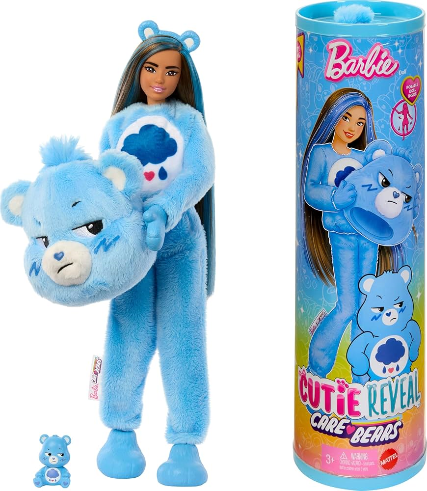 Las muñecas de la colección Care Bears de Barbie Cutie Reveal ofrecen una experiencia de lo más adorable al abrir la caja, ya que incluyen 10 sorpresas. Al abrirla, descubrirás a uno de los tres personajes de la colección Care Bears; puede ser Mimosa, Generosa o Quejoso. Retira el adorable disfraz de peluche para descubrir a la muñeca Barbie articulada. Qué muñeca te tocará? Sigue descubriendo sorpresas como una falda, una diadema, unas gafas de sol, unos zapatos, un peine con esponja y un Oso amoroso a juego en miniatura. Dale la vuelta a la parte superior del disfraz de peluche para convertirlo en una chaqueta de pelo y usa la cabeza como una cama para mascotas. Para una experiencia todavía más adorable, moja con agua el pelo de la muñeca y disfruta de las transformaciones de cambio de color tantas veces como quieras. A los niños y las niñas les encantará descubrir y coleccionar todas las encantadoras sorpresas de la colección más adorable. Las muñecas se venden por separado y están sujetas a disponibilidad. Las muñecas no pueden tenerse en pie por sí solas. Los colores y la decoración pueden variar.