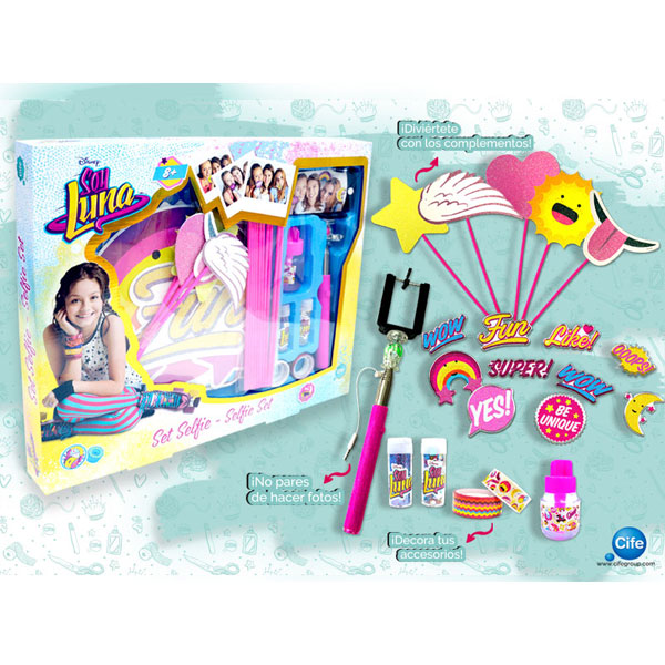 Coge tu Set Selfie Soy Luna y retrata los momentos más divertidos con tus familiares y amigos. ¡Además, de una forma muy original, porque este palo selfie se completa con un montón de accesorios para realizar unas fotos únicas. Puedes utilizar los accesorios que se incluyen con palo o crear los tuyos propios con todos los complementos de diseño que contienen este set. El palo selfie no necesita batería y se puede utilizar tanto con dispositivos iOs como Android (sólo es necesario descargarse una aplicación). Edad recomendada: +8 años.