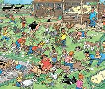 Puzzle con 360 piezas de la marca Jumbo con divertida ilustración de un loco y divertido día en la granja. Todos corren de un lado a otro con sus animales favoritos.