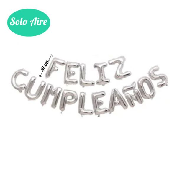 SET FELIZ CUMPLEAÑOS DE GLOBOS FOIL METÁLICOS CON FORMA DE LETRA DE 45CM DE ALTO EN COLOR PLATA.