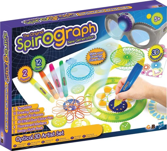 Con Spirograph podrás realizar los más bonitos dibujos con formas geométricas. Coloca una forma en el soporte, toma tu lápiz o marcador y sigue las formas: ¡hay miles de creaciones diferentes posibles, grandes y pequeñas! Dale aún más vida a tu dibujo con los rotuladores fluorescentes. ¿Estás listo? ¡Luego ponte las gafas 3D y observa cómo tu dibujo se vuelve 3D!