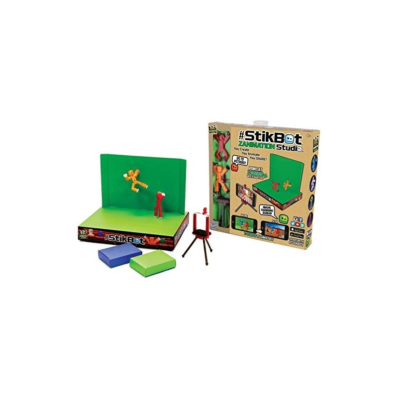 Crealo, anímalo y compártelo! El set Stikbot cuenta con la plataforma que servirá de fondo para tus imágenes animadas, dos figuras artículables, trípode y dos pantallas.